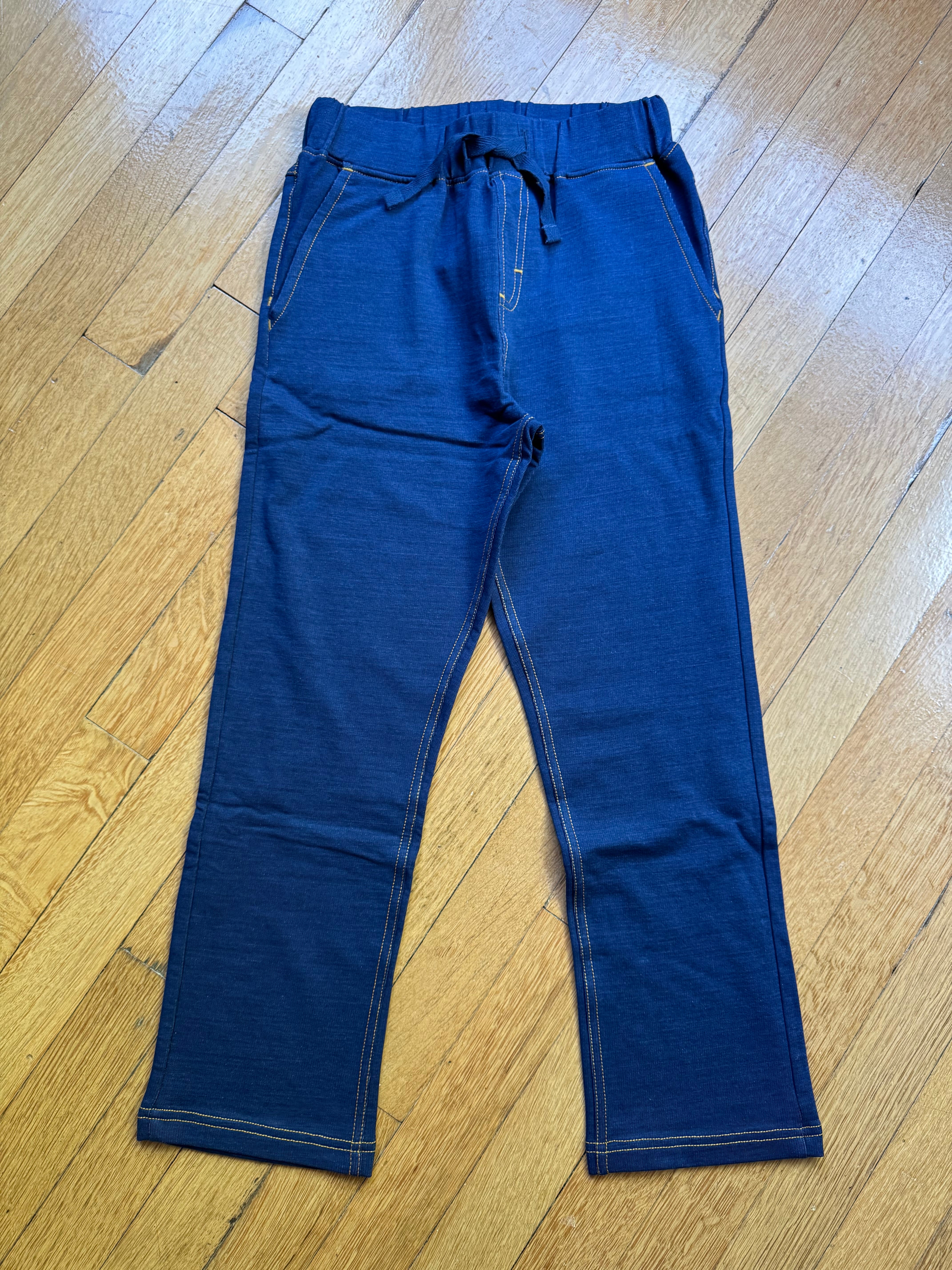 This is an easy to wear pair of soft sweatpants which look like jeans but they're made of soft organic cotton.