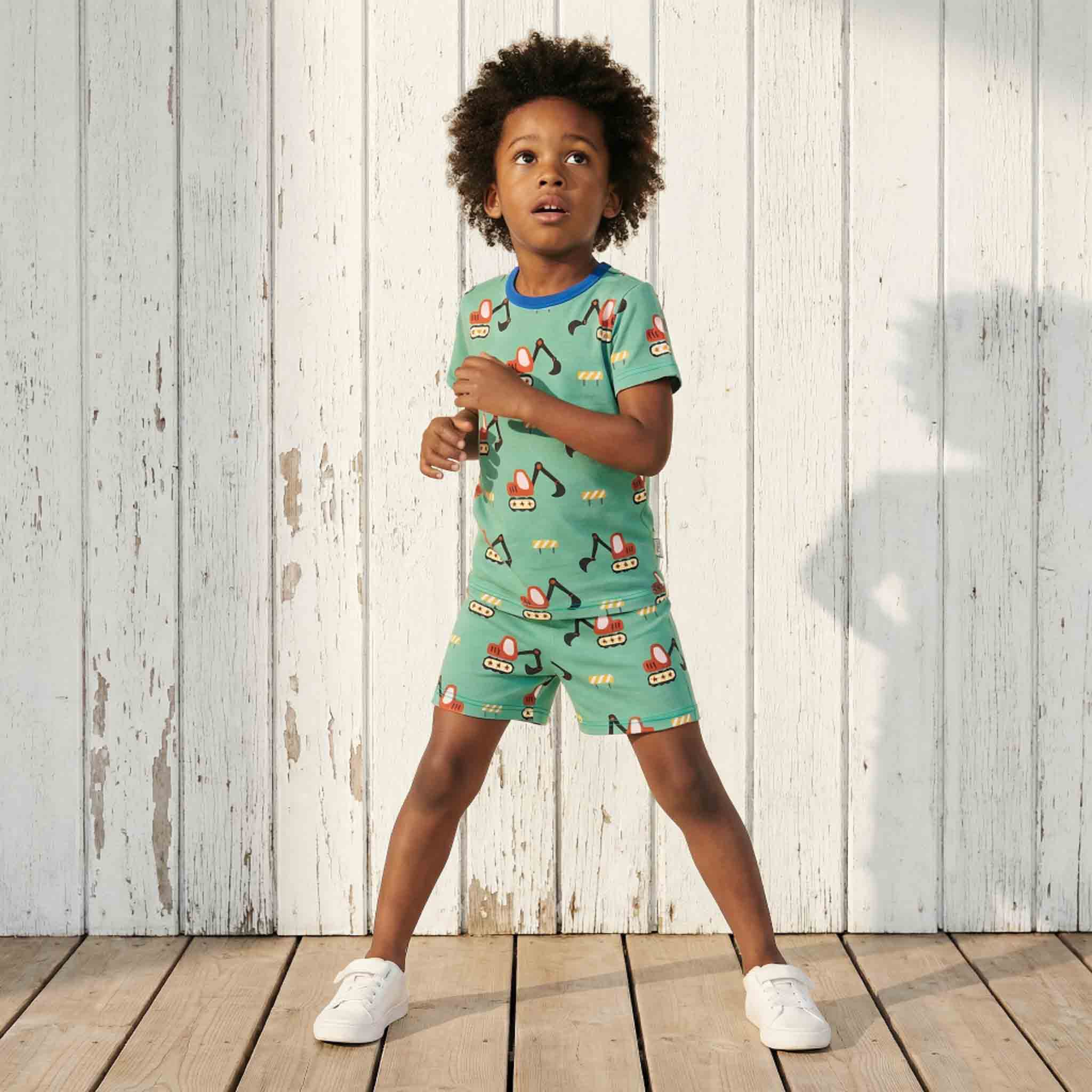 This is a striking short sleeved Excavator print pyjama set, comprising of a short sleeved pj top with matching pj bottoms – in the green colour palette.