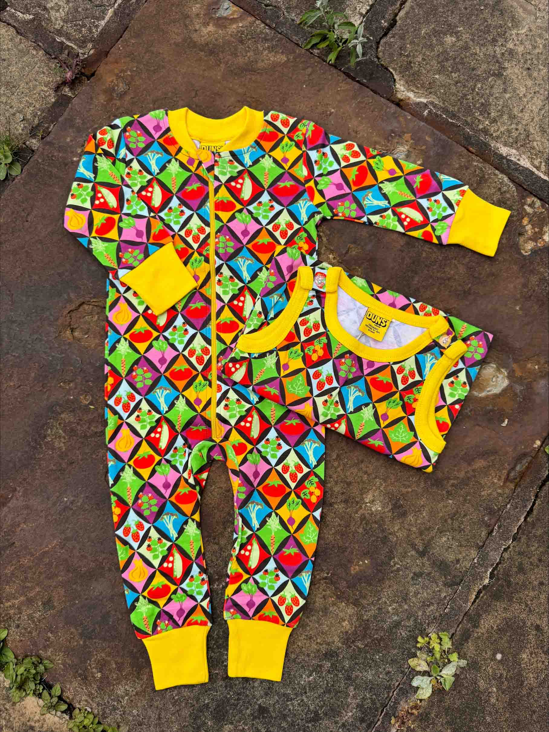This is a full length zip up rompersuit/ zipsuit in the Harlequin Veggies print. Please note : these zip rompersuits are slim fitting (especially the larger childrens sizes 128-158) please kindly refer to the handy measurement guide below to avoid disappointment. A 158cm would roughly fit a UK 8-10.