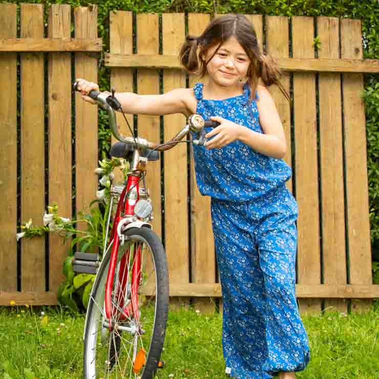 Lovely and soft dark blue flower jumpsuit with tie straps and elasticated waist. Runs slim fitting. Exceptional quality and quirky design as you would expect from Danish Designer Alba of Denmark!
