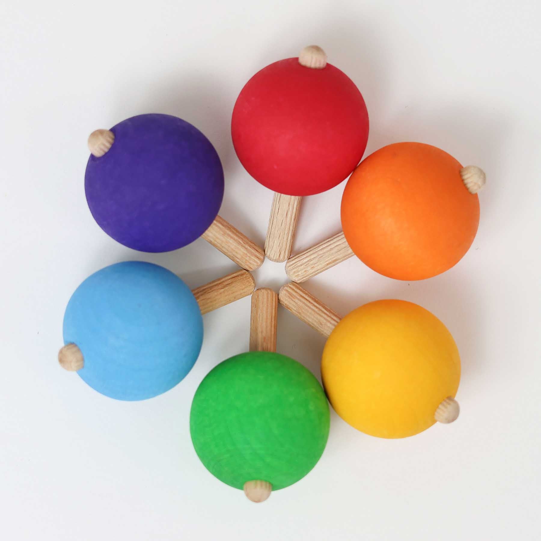 This is a six piece set of Grimms Rainbow Spinning Tops; all in beautifully bright colours.