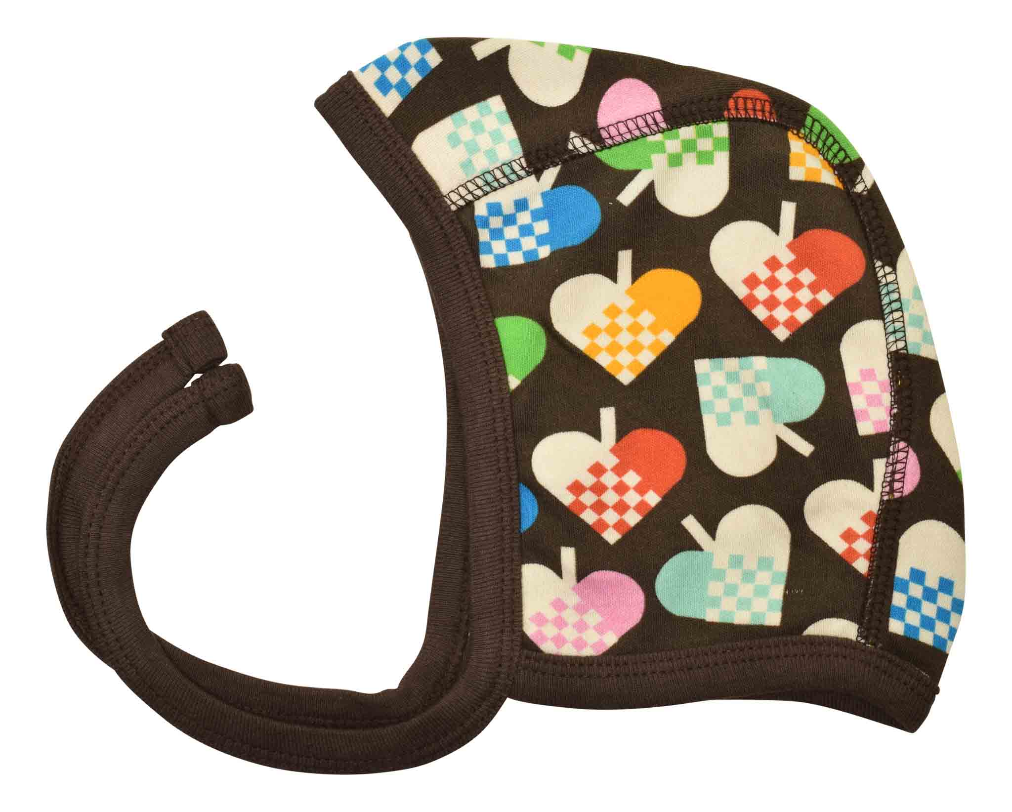 This is an easy to wear baby cap with handy ties, in the Hearts print. Please note all sizes are approximate and based on actual head circumference in cm.