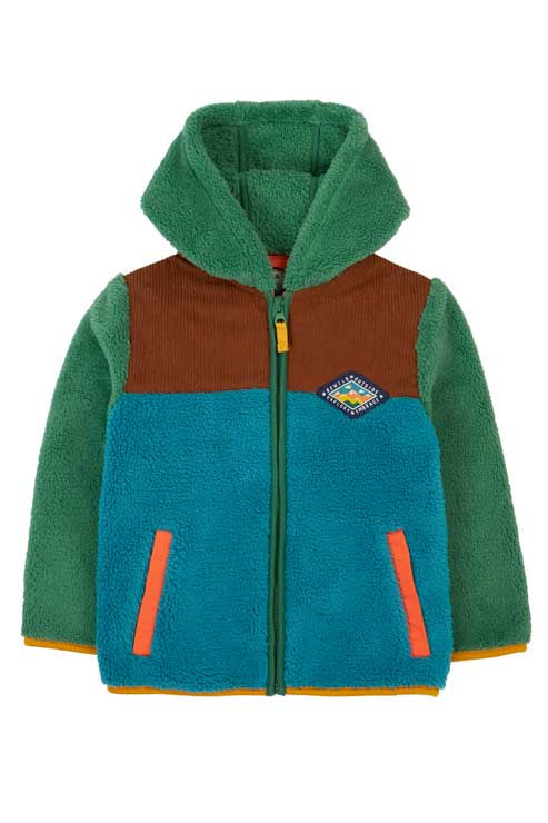 Zipped front hooded borg fleece jacket made from post-consumer recycled plastic. Features 2 front pockets, jersey binding at hem edge and cuff for a neat finish. 3 piece panel hood for the perfect fit and a full length protective zip guard. Oeko-Tex standard 100 certified. This garment is part of Frugi’s Circular Collection, meaning it has been designed to be recycled into new fabrics at the end of its life, helping reduce textile waste