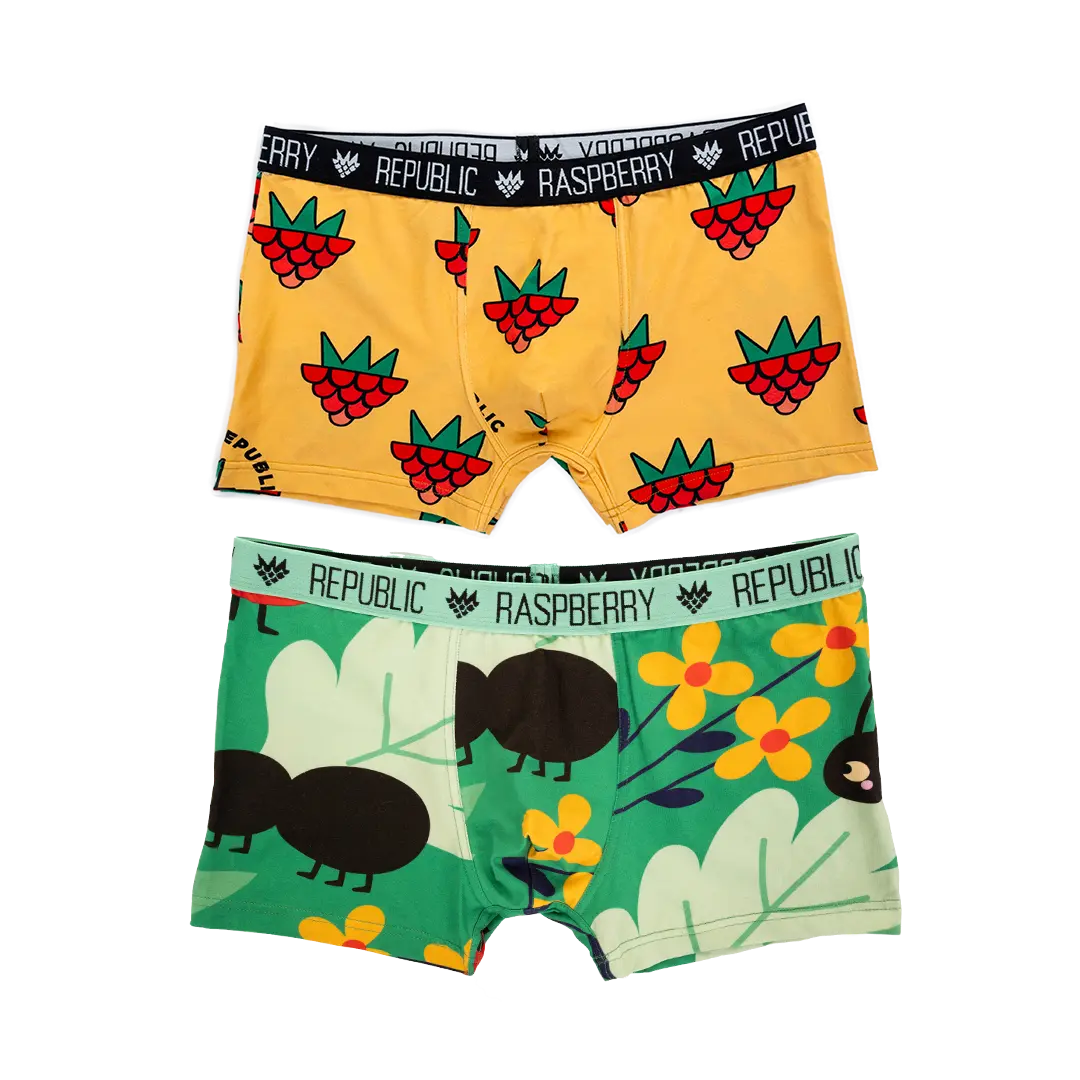 You will receive one pair of boxer shorts in the Anthill Green print and one pair in the Raspberry Republic print. Made of certified organic cotton.Β
