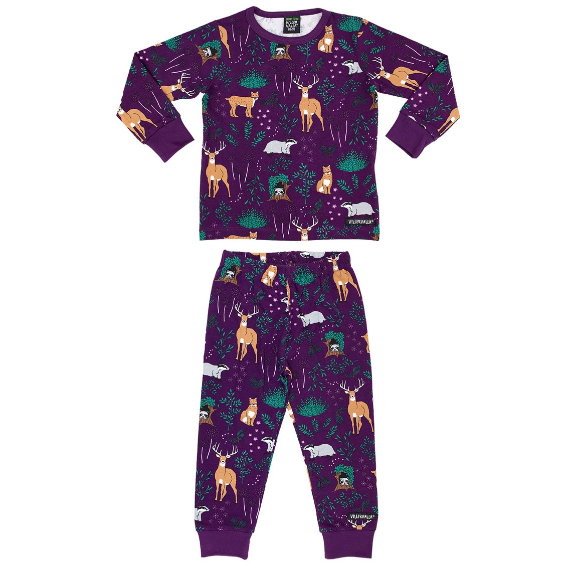 This is a striking long sleeved Winter Forest print pyjama set, comprising of a long sleeved pj top with matching pj bottoms in the grape colour palette.