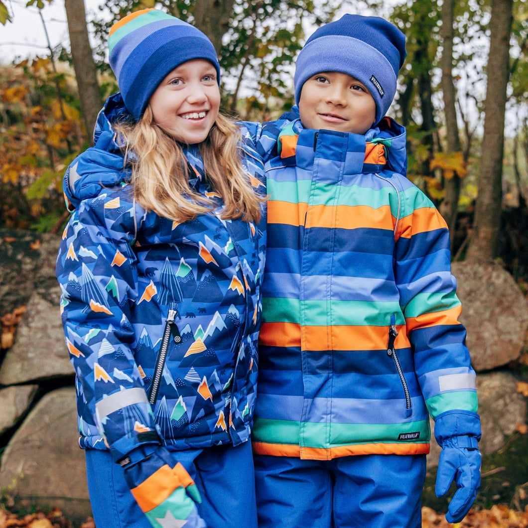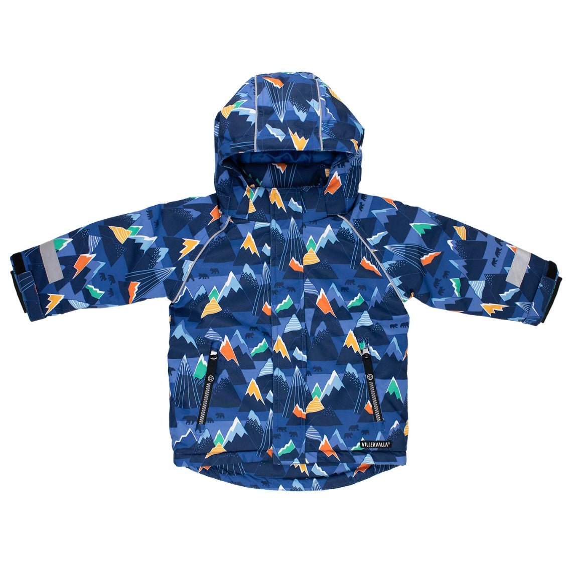 This is a Winter jacket in the Mountain print, is waterproof (8000mm) functional and padded. Breathable, with taped seams. Adjustable at end of sleeve and snow stop with thumb hole. Detachable and adjustable hood. Reflective tape on sleeves and reflective starprint on the back.